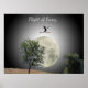 Gymnast soars over a full moon in a "flight of fancy". Moon glow brightens the dark sky and outlines the gymnast stretching in mid-leap. Hillside and trees create the base for the scene.