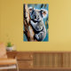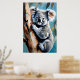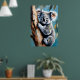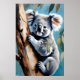 An HD portrait poster in painting style depicting a specimen of a Koala that remains hanging from a tree with a smiling and curious face