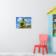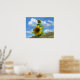 Sunflower blossoms. Two bright yellow sunflowers with brown hill, blue sky and fluffy white clouds in background. This image will brighten up any room.