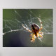 Spider repairing it's web after having caught it's lunch. Web filaments are torn and tangled. Spider is white and brown, viewed from under side.