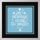 This poster is shown with Black borders, Sky Blue background with White text in topography style design reading " There's always a reason to smile". Customise this item or buy as designed.