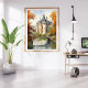 In this gorgeous watercolor illustration you can see the image of an old French castle hidden behind golden autumn trees. The castle is surrounded by a body of water and we can only get to it through an ancient narrow bridge. This romantic landscape brings to mind our historical past and the lives of people in ancient times.