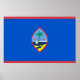 This poster proudly displays the flag of Guam, characterized by a dark blue field with a narrow red border and a central emblem. The emblem features a stylized, white-bordered river, a coconut tree, and a flying proa boat, symbolizing Guam's natural beauty, cultural heritage, and seafaring traditions.