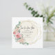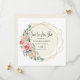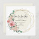 An elegant way to let friends and family know you have rescheduled your wedding. A gold geographic frame surrounds your wedding date details. The soft beige background highlights the text. Save Our New Date is written in a modern script, with details following. Pink roses and hydrangea flowers are nestled in green foliage leaves decorate the geometric gold frame. The save our new date card back is beige.