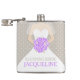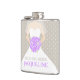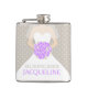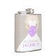 Elegant graphic bride with veil holding a posy of purple lilac stylised roses wedding hip flask. Reads Blushing Bride Jacqueline. Personalise with your own name and title or words to help calm the bride on her big day. Also a great gift idea for bridal showers, hen nights or wedding rehearsals.