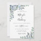 Watercolor garden flowers in chic and trendy shades of powder and dusty blue with soft green botanical branches, wedding invitation. Back of card features solid coordinating blue colour. Customise text, font style, colour and size.
