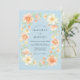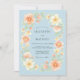 This design features a serene powder blue background adorned with a lush arrangement of watercolor florals. Delicate peach roses and apricot blossoms are paired with pale yellow wildflowers and soft green leaves. The overall aesthetic evokes a romantic spring atmosphere, perfect for a graceful outdoor event or an ethereal morning ceremony.