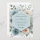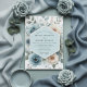 This design features a soft array of powder blue and blush-toned blooms with delicate greenery accents. The artistic floral arrangement evokes a gentle, romantic mood.