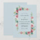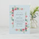 This design features a serene powder blue background adorned with a vibrant arrangement of watercolor florals. Delicate pink roses and peonies are intertwined with muted teal blossoms and lush green foliage. The artistic botanical elements create a romantic and airy atmosphere perfect for a seasonal nuptial event.