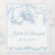 Add a refined French touch to your wedding tables with this elegant Toile de Jouy wedding bottle label in a soft powder blue palette. Inspired by classic 18th-century French engravings, the design features an ornate floral frame and a delicate hanging flower basket illustration, creating a timeless and romantic aesthetic.