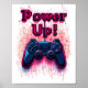Power Up! Gaming Controller- A black video game controller with red accents is depicted against a white background. The controller is positioned in the centre of the image, with the phrase "Power Up!" in pixelated, pink letters above it. The background features a stylised circuit board pattern in Tones of pink and blue, creating a powerful and energetic atmosphere.