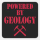 Powered By Geology - black sticker with red stencil lettering and crossed rock hammers graphic.