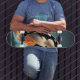The skateboard has a visual design of an impressive orca jumping out of the water. The image he evokes is that of an orca fish, also known as killer whale, showing his power and grace while making a spectacular leap. The representation on the skateboard highlights the majesty and strength of the marine animal, capturing its dynamic movement and the sense of freedom associated with its leap. This design provides a unique and striking aesthetic to the skateboard, merging the beauty of nature with the urban style of sport.