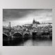 A black and white photograph of Prague Castle viewed over the Vlatva River by the Manesuv Most Bridge is featured on this poster.