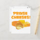 Praise cheeses! with assorted cheese wheels including cheddar and swiss.