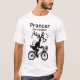 Steal the spotlight this season with our Prancer Riding a Bike graphic tee—where Santa’s flashiest reindeer ditches the runway for the velodrome. Picture Prancer popping a track-stand on a glitter-chrome pursuit bike, one hoof on the hip, antlers cocked like a supermodel’s wink. A rainbow of Northern Lights streaks behind him while his speech bubble struts: "Darling, this is my catwalk!"
