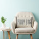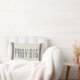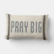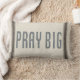 Lumbar pillow with brown stripes and the words "Pray Big" in grey lettering.