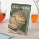 A cute chipmunk is posed as if in prayer on a fallen tree branch.