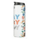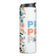 This spiritual graphic features the powerful message "PRAY on it / PRAY over it / PRAY through it" in bold, colourful block letters and elegant script. The central text is beautifully framed by lush vertical borders of watercolor-style blue and peach flowers with green leaves. Set against a clean white background, the design offers serene encouragement for steadfast prayer.