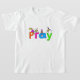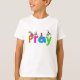 Cute cartoon illustration of happy and diverse little boys and girls climbing over giant letters of the alphabet that spell out the word PRAY. Image available on various gifts and products. T-shirts. Hoodies.