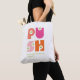 This girlie tote bag features the word PUSH in a modern pink and orange simple daisy font with the copy "pray until something happens" below. The back side of this pretty tote has a pink and green daisy pattern and is personalised with your monogram initial and name.