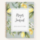 This modern elegant prayer journal features watercolor lemons with lush green leaves and olives on a sage green background.
