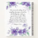 Inspirational quote scripture personalised Prayer Journal depicts a simple floral watercolor design with lavender, blue and purple flowers. The back features Bible Verse Philippians 4:6-7, "Be anxious for nothing, but in everything, by prayer and petition, with thanksgiving, make your requests known to God. Then the peace of God that surpasses all understanding will guard your hearts and minds in Christ Jesus."