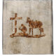 Rusted praying cowboy kneeling in front of a cross with his horse on an aged background.