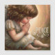 Cute, little, brown haired, praying angel painting with rosy cheeks, dressed in off-white gown and a radiant light halo, and a prayerful message of Peace. Peace typography has swirl and scroll lettering.