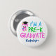 A cool personalised preschool graduation button for a little girl graduating from Pre-K and moving on to kindergarten. It features a cute pink owl wearing a graduation cap and carrying a scroll next to a fun font in blue, green, and pink.