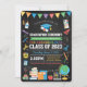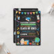Colourful graduation invitation for Pre-Kindergarten class, edit for any year. This design features a chalkboard backdrop and colourful school supplies and elements. Customise this design for your Pre-K class! Also available for Preschool, Kindergarten and Fifth Grade!