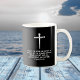 Pastor Appreciation Mug: Three Nail Christian White Cross | 2 Timothy 4:2 "Preach the word..." KJV Bible verse. Modern black and white design.