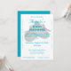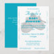 Design features a white background to the image of delicate crocheted baby booties. Text is featured in a bright ocean blue, the name of guest of honor in a large, elegant font. Event type is displayed in a large, bold font. Message, date and time are displayed below in an easy-to-read print. R.S.V.P. information is displayed at bottom. An elegant flourish borders design.