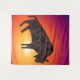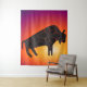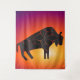 Prehistoric Animals Fiery Bison or Bull wall hanging. Ancient animals inspired by petroglyphs throughout the world. An ancient art work of an animal in their environment. This looks like a bull or bison animal from the past ancient cave drawings. Colourful sunset background with ancient fiery lava bison. Inspired by petroglyphs.