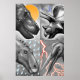 Four portraits of Cretaceous life: the dinosaurs Tyrannosaurus, Triceratops, Edmontosaurus, and the pterosaur Infernodrakon, rendered in a stylized black and white look with splashes of elemental color in the background.