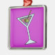 A brightly coloured martini glass filled with a wavy rainbow of cocktail fun and garnished with the classic cocktail olive on a martini pick. Perfect for any party or happy hour celebration.