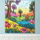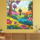 This is a vibrant and dynamic painting that portrays a lush, storybook-like landscape. The artwork features bold, black outlines that define every element, giving it a graphic novel aesthetic. Towering, sturdy trees with textured brown trunks dominate the scene; some bear bright green foliage, while others are adorned with rich purple leaves, suggesting a fantastical forest.