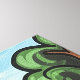 The background unfolds with rolling hills depicted in distinct bands of vivid greens, oranges, and pinks, creating a layered and almost quilted appearance. A flowing blue body of water meanders through the midground, its surface reflecting a bright, almost iridescent quality.
