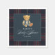 Add preppy charm to your celebration with our Bear Baby Shower Paper Napkins. Featuring a loveable teddy bear in a varsity jacket holding an American football, set against a navy background with red and blue Scottish tartan accents. Elegant calligraphy and classic fonts complete this timeless, personalised design — perfect for brunches, dessert tables, or cocktail hour.
