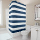 Preppy shower curtain featuring a navy blue and white stripes pattern.