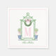 This Christmas napkin design has a Preppy Chinoiserie design featuring a green bamboo pagoda frame with a Christmas wreath with a pink bow and two topiaries in Chinoiserie pots. You can personalise with a name and your initial.