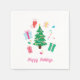 Festive holiday napkins featuring a merry and bright Christmas tree, holiday gifts, rainbow candy cane and pink and red stocking.