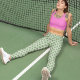 Show off your love for pickleball wherever you go with these cute patterned leggings. They features illustrations of heart-shaped pickleball paddles in green and pink pickleballs against a green and white gingham patterned background.