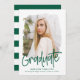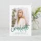Trendy graduation party invitations featuring the graduate's photo inside of a textured mask frame with "Graduate" in a green handwritten script. Personalise the front of the photo graduation party invites by adding the graduate's name, school name, and graduation year. The invite reverses to display your graduation party details with a green and white striped pattern.