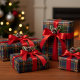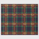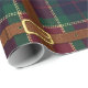 This design features a classic tartan or plaid pattern in rich, traditional colors like deep navy blue, dark green, and maroon red with hints of yellow or cream, creating a festive and cozy aesthetic. Overlaid on the plaid is a repeating, grid-like pattern of brown leather straps with gold buckles, evoking the look of luggage, equestrian gear, or a secured trunk. The combination of the warm plaid and the strapped detail makes this a sophisticated and robust design, perfectly suitable for Christmas wrapping paper that suggests a feeling of tradition, quality, and rustic holiday charm.