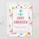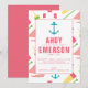 Ahoy! It's a birthday party! Celebrate you little one's nautical themed birthday party with this fun invitation. The pattern features many nautical themed silhouettes: anchor, sailboat, ship's wheel, buoys and oars. The colour scheme is ideal for a girl featuring bright, nautical colours. Shop the entire collection to create a coordinated party.