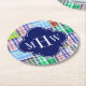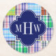 Preppy Patchwork Madras Navy Quatrefoil Monogram Round Paper Coaster