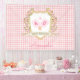 Set the stage with this beautiful custom pickleball birthday party banner. This design has a watercolor image of a crest surrounded by branches with pink gingham pickleball paddles in the centre. There is a pink gingham border in the background. Text says "Happy Birthday." Colours used include moss green, blush pink and and tan. You can personalise with a name and birthday year.