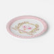 Set the stage with these beautiful custom pickleball birthday party plates. This design has a watercolor image of a crest surrounded by branches with pink gingham pickleball paddles in the centre. There is a pink gingham border around the edge. Colours used include moss green, blush pink and and tan. You can personalise with a birthday year.