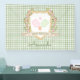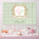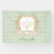 Set the stage with this beautiful custom pickleball birthday party banner. This design has a watercolor image of a crest surrounded by branches with green and pink gingham pickleball paddles in the centre. There is a green gingham border in the background. Text says "Happy Birthday." Colours used include moss green, blush pink and and tan. You can personalise with a name.